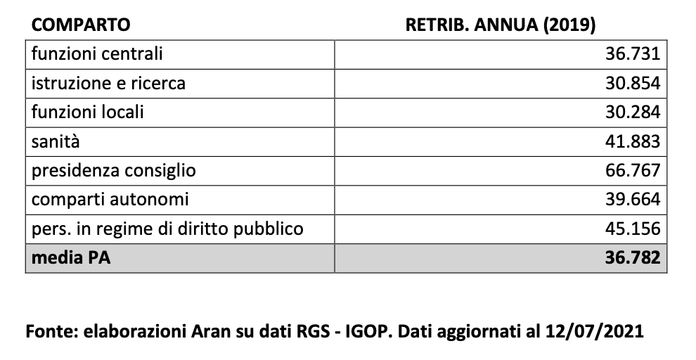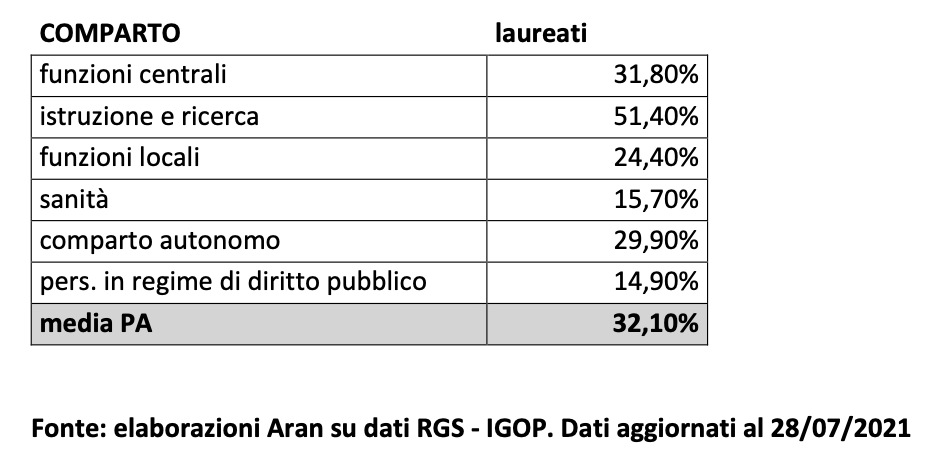 La situazione non è molto diversa, né migliore, se anziché guardare all’esterno rimaniamo nei confini del nostro Paese, mettendo a confronto le retribuzioni dei diversi comparti della Pubblica Amministrazione. Dei 3,2 milioni di dipendenti pubblici, oltre un milione è impiegato nella scuola. Di questi, il 51,40% è impiegato su profili che richiedono il possesso di un titolo di laurea, la percentuale di gran lunga più alta nell’ambito della Pubblica Amministrazione, dove la media di personale laureato si attesta al 32,10%. Nonostante ciò, la retribuzione media del comparto istruzione e ricerca, di cui la scuola è settore largamente prevalente, occupa posizioni da fondo classifica, superando solo di poco le retribuzioni del comparto funzioni locali.