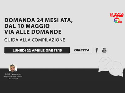 Delle graduatorie, dei requisiti, della compilazione della domanda si parlerà nel corso della trasmissione “La Tecnica risponde” di oggi, lunedì 22 aprile, in diretta sui canali Facebook e Youtube della rivista La Tecnica della Scuola a partire dalle ore 17,15.